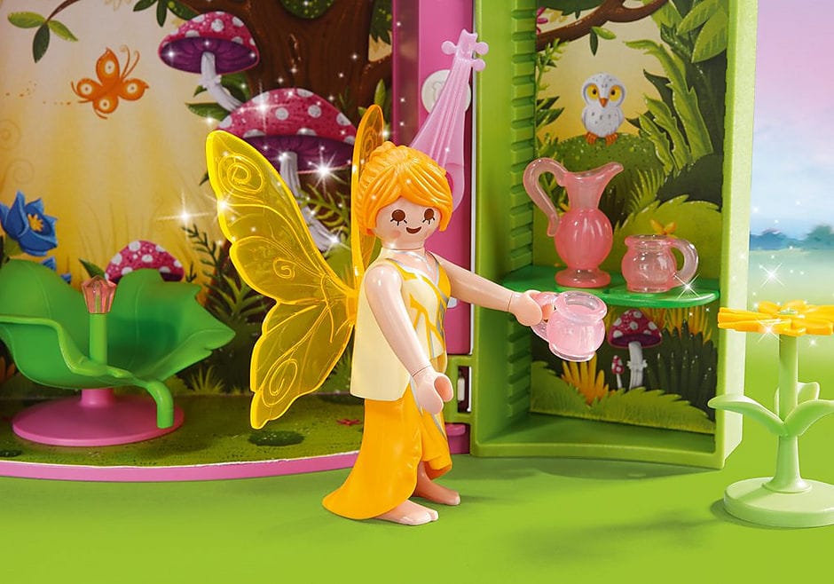 Figures: 1 adult fairy with wings, 1 child fairy Animals: 1 unicorn Accessoires: 1 play box, 1 magic wand, 1 leaf chair, 3flowers, 1 flower hat, 1 carafe, 2 glases, 1 flute, 2 lutes
