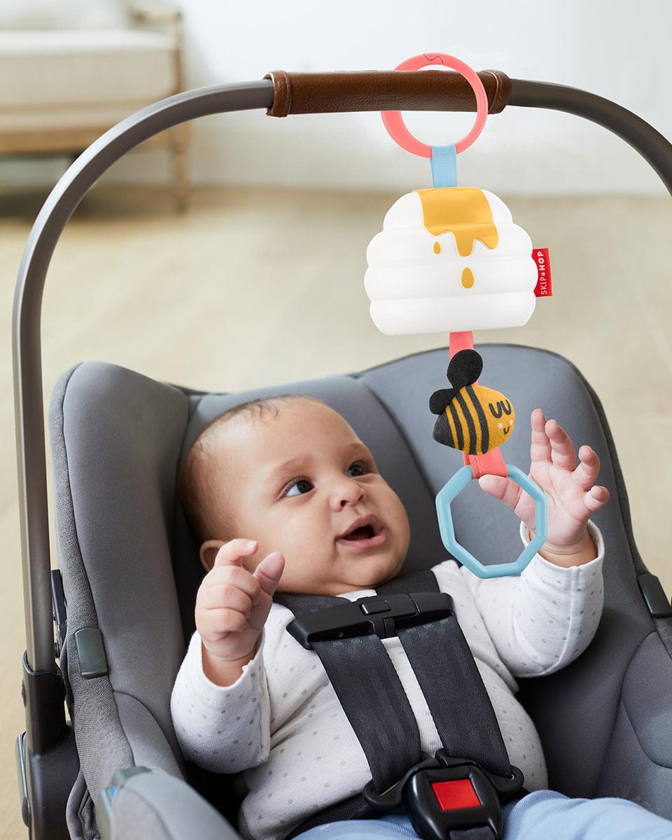 Keep your busy bee entertained with our buzz-worthy beehive stroller toy. Soft and plush to the touch, just pull the ring to wake-up the honey bee and shake-up the hive. Attach it to your stroller and keep baby smiling wherever you go. Perfect for at-home play, too!