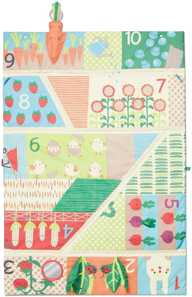 - Mat features include: baby-safe mirror, crinkle peek-a-boo leaves, pocket to pop carrot in and out, variety of textures for tactile exploration