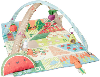 - Five hanging toys include: Plush tomato, avocado rattle, beet squeaker, carrot with tactile ribbons, musical bunny with carrot teether