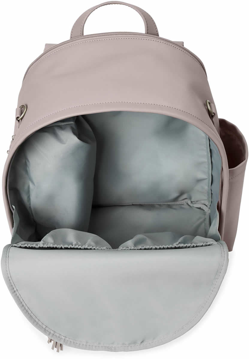 - Large main compartment with secure zip closure holds diaper bag essentials