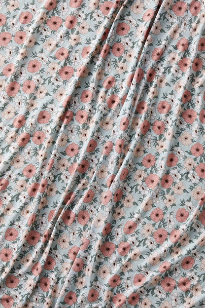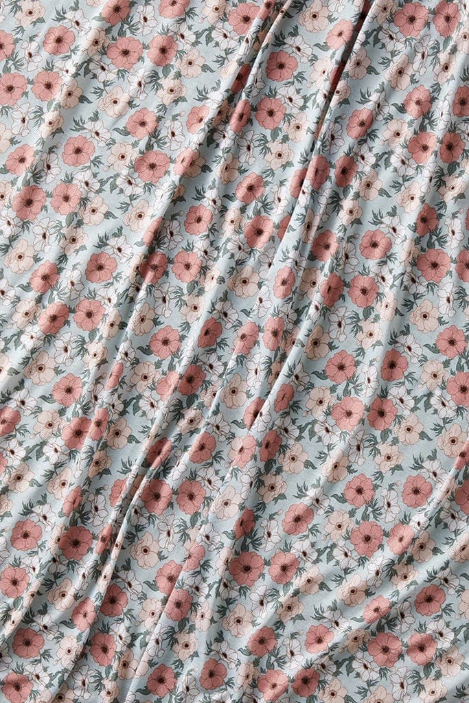 Windflower: Anemones in muted pinks and white nestle together atop a sky blue base. Designed in collaboration with Teresa Chan. Print is one-sided.