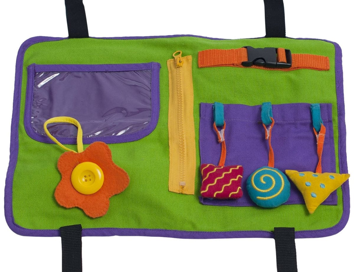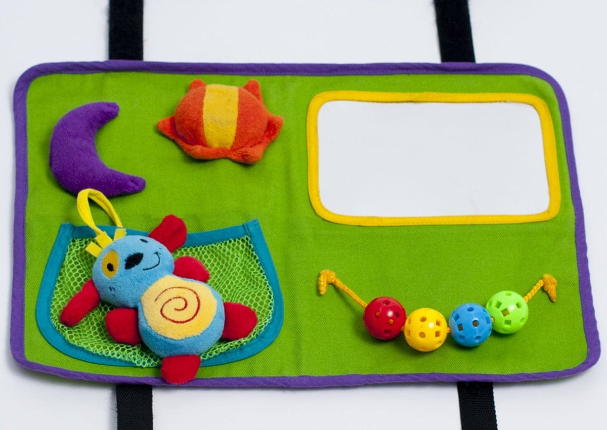 - Includes peek-a-boo mirror, squeaky toy, crinkle toy, mesh pocket with plush friend, photo pocket, button and unbutton flower, strung beads and removable shapes.