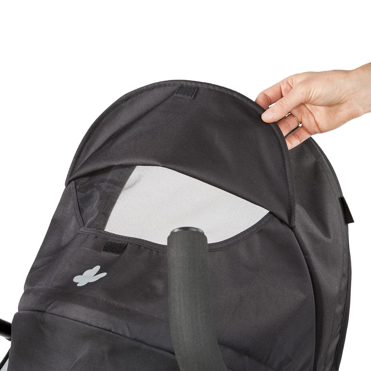 - Oversized, one-hand adjustable canopy with peek-a-boo window