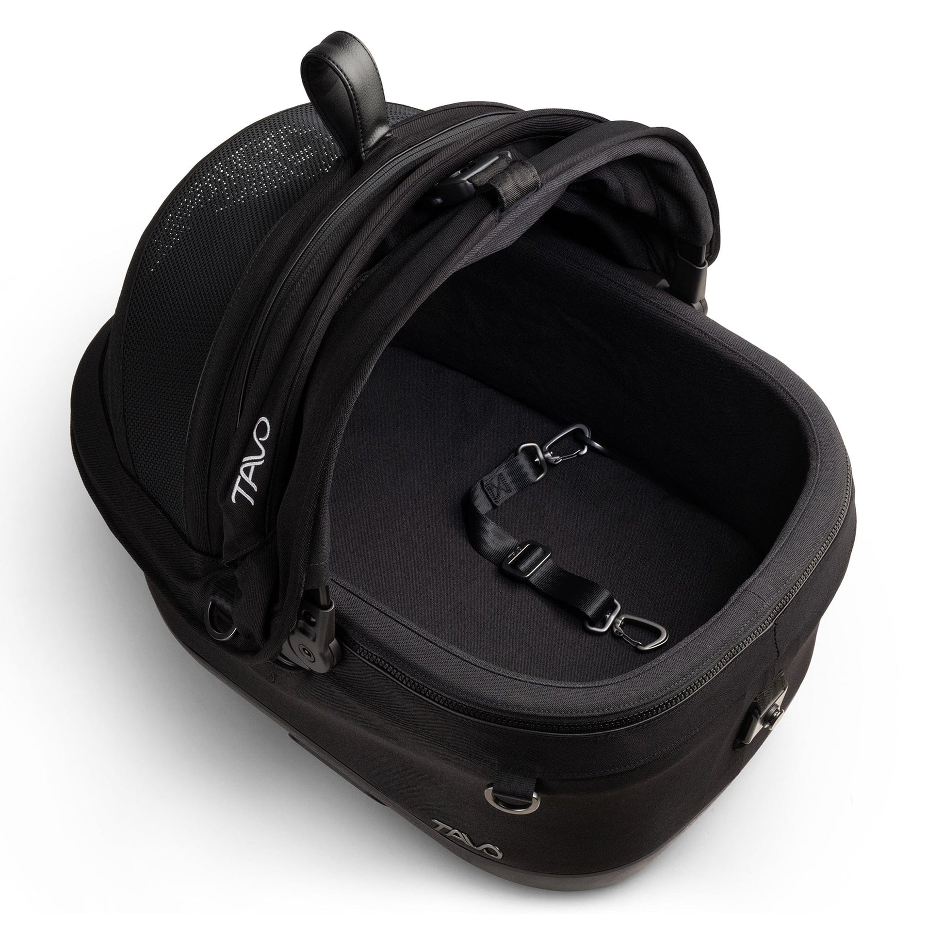 - High-strength alloy leash attachments available on both sides of the carrier interior.