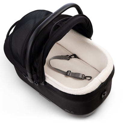 - Durable matte-black stroller frame is lightweight and thoughtfully designed.