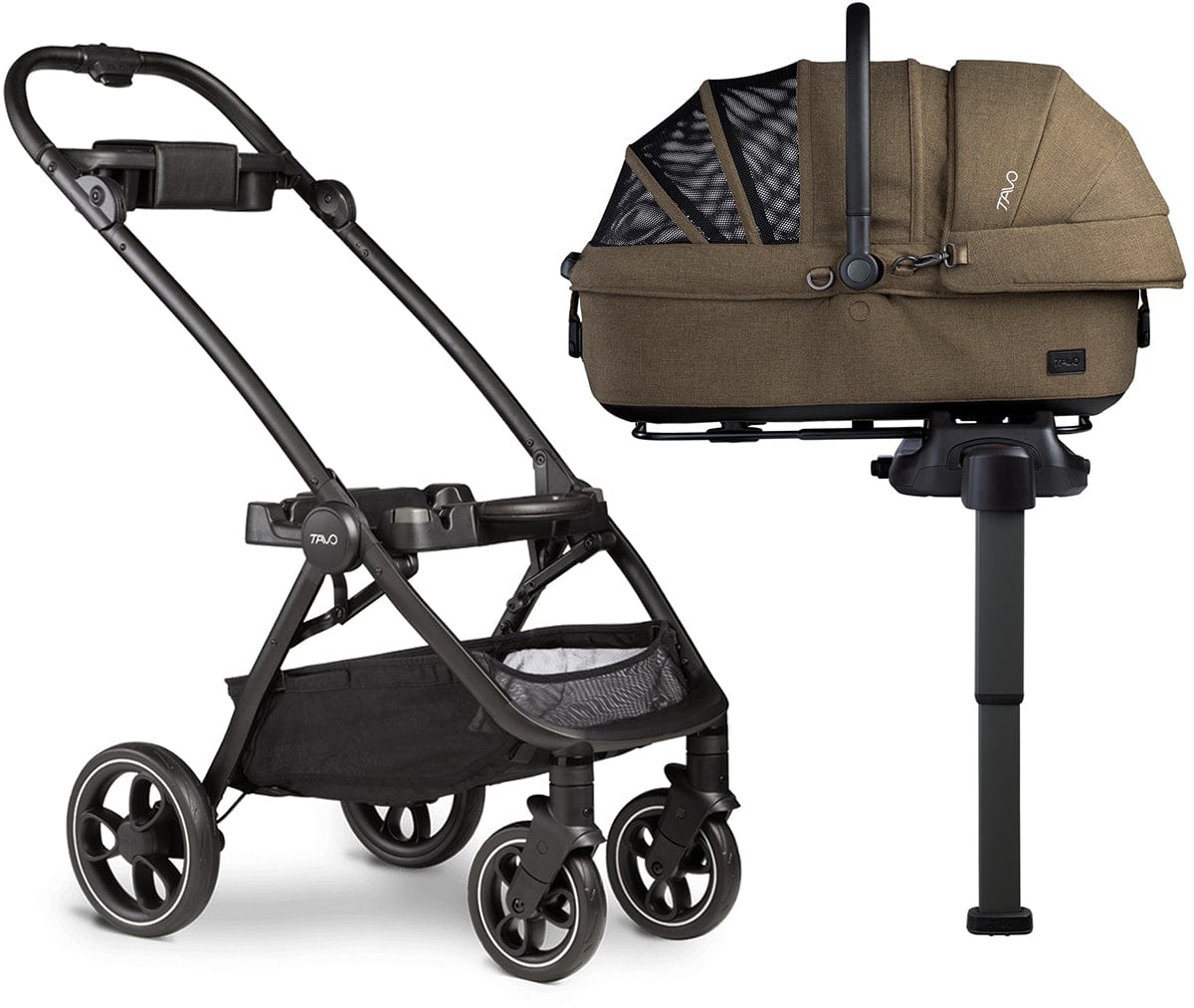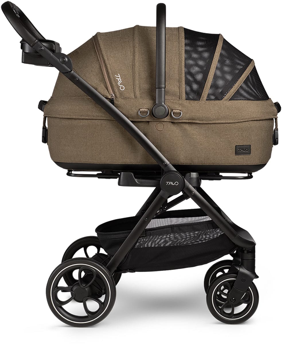Tavo’s Maeve Pet Protection System comes with a cozy bed and carrier that connects quickly to the included vehicle base with stability leg and to our premium Roscoe stroller frame—taking your pet’s adventures inside and outside the vehicle to the next level.