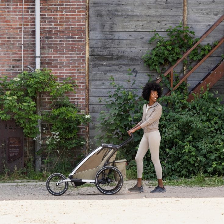 • The redesigned FlipWing-system allows for even easier switching between biking and strolling and back, now with the possibility to flip the wheels up and down while the trailer is attached to the bike.