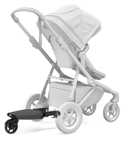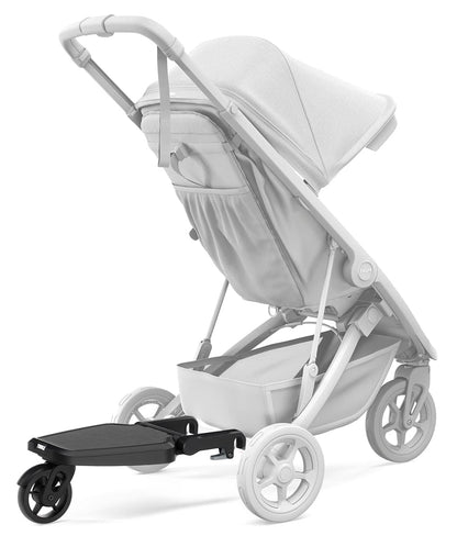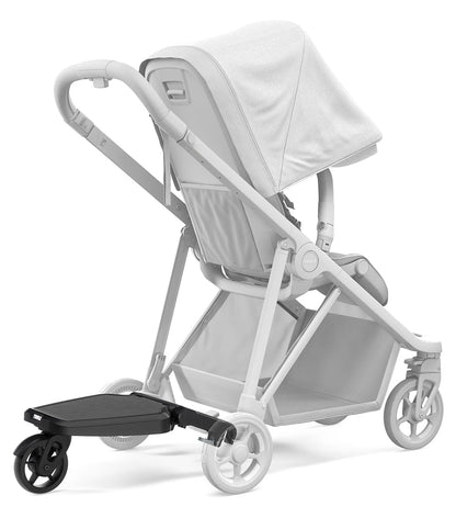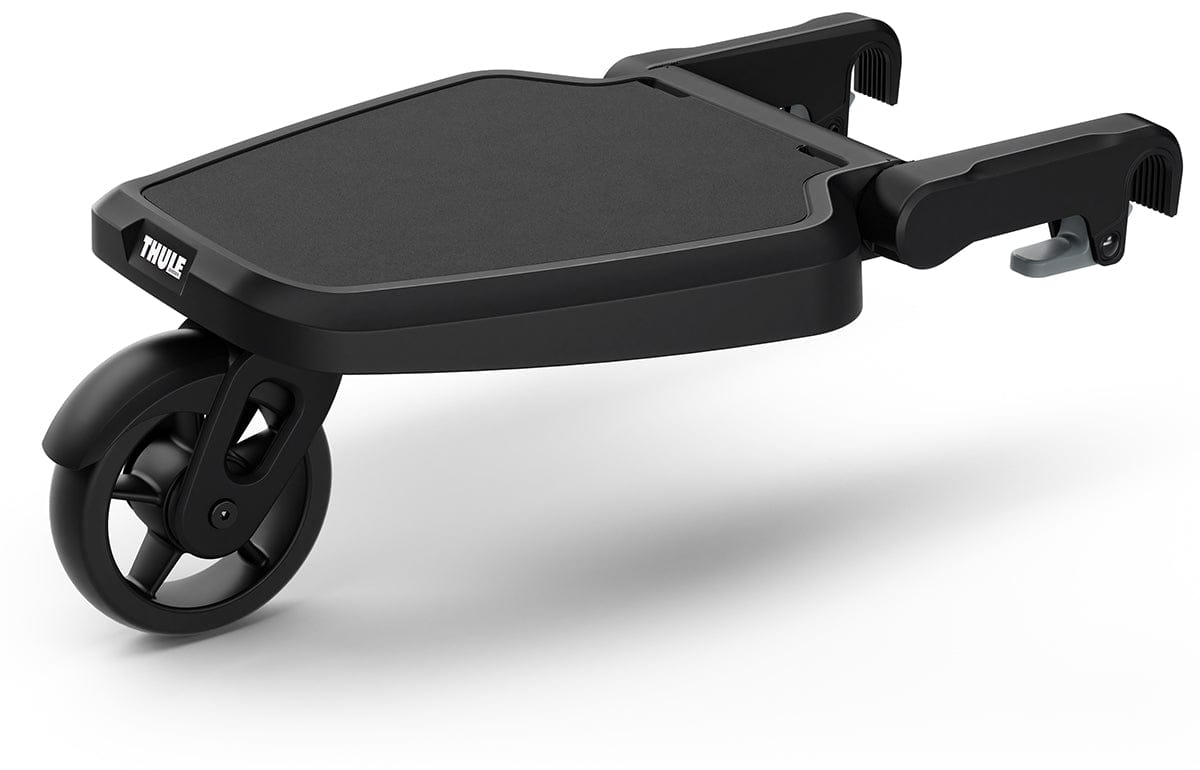 Thule Rider Board allows an older child to jump on board and ride along on the stroller, which makes this stroller board practical if you enjoy long walks with your kids. It is easy to install, has a puncture-free wheel, and anti-slip tape on top of the board.