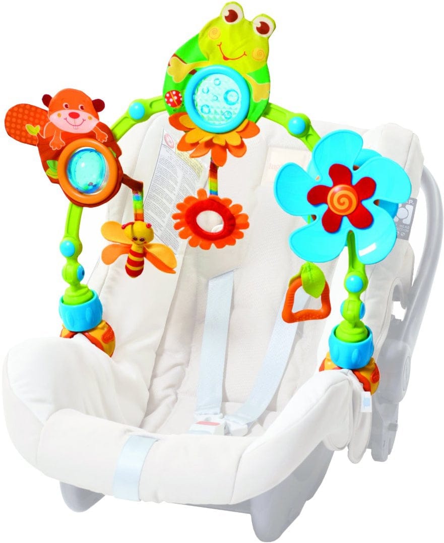 Like the popular Sunny Stroll, the My Nature Pals Stroll is an essential for the busy baby-on-the go. They will love the crinkly frog, baby activated propeller, flower mirror and easy-to-grasp teether handle. The arch easily angles backwards or towards the baby, so it can be set to baby's individual reach. Parents will love the easy on universal attachment clips.