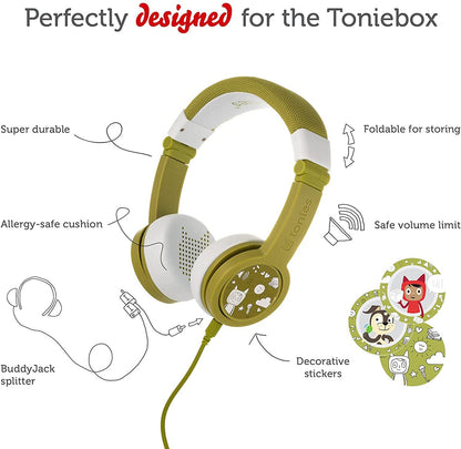 Meet the Tonies Headphones! These foldable, durable, kid-safe, volume-limiting headphones come in six colors to match your Toniebox. Each headphone set includes a matching sticker set and a detachable audio cable with a BuddyJack splitter for sharing storytime with up to four sets of headphones from a single Toniebox.