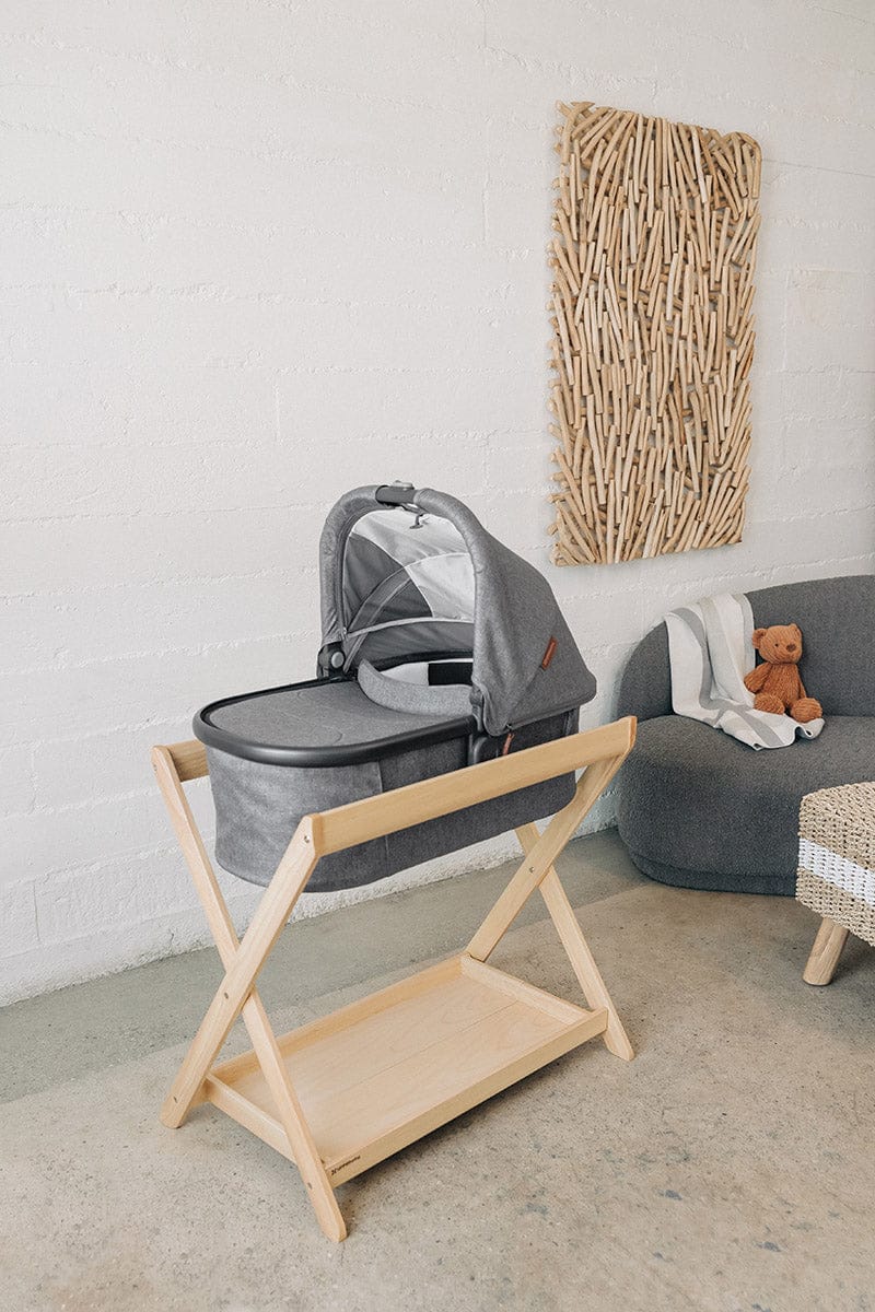 The UPPAbaby® Bassinet Stand allows you to move a sleeping baby from stroller to bedroom without interrupting their slumber. Easily snap your UPPAbaby bassinet into this sturdy grey bassinet stand, then fold the stand and stash it when not in use. It even has a tray on the bottom to store naptime necessities. This is one accessory that grows with babies: When it's time for a bigger sleeping space, the stand converts into a laundry hamper with the addition of the Bassinet Stand Hamper Insert (sold separately).