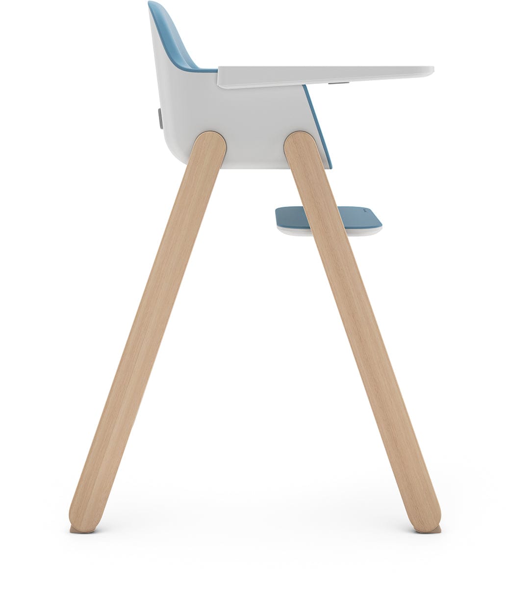 The Ciro High Chair has a sleek design, unique harness that adjusts with the push of a button (in the back) and an adjustable tray that’s slightly higher, allowing it to extend over the dining table so baby is closer. The dual-position rotating footrest starts at a higher position and then flips over to a lower position as they grow. The seam-free seat and food-friendly harness also make it easy to clean.