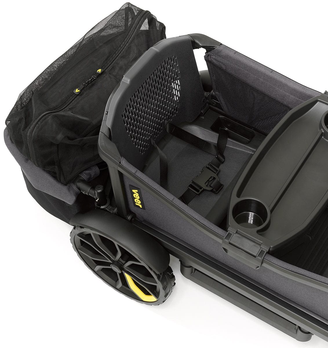 A removable snack tray has two cup-holders built in, the sides have webbed pockets to hold necessities, and each seat has a built-in well for trinkets and snacks. Up to 6 cup holders can attach to keep refreshments in reach. At the end of a busy day, Veer can easily be hosed off, ready for the next adventure. It folds easily for compact storage and is self-standing.
