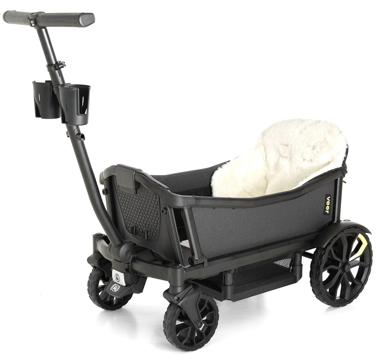 during particularly chilly adventures, you’ll enjoy easily sliding this ultra-soft vegan shearling– made of snuggly 100% polyester–into the cruiser’s seat for toasty warmth and cozy comfort. seat harness glides easily through slots in the cover to ensure continued safety. shearling seat cover can also be fitted over the toddler comfort seat. better yet, two covers can be used simultaneously (one on each seat) and cruiser still folds up neatly without removing them. shearling seat cover also pairs well with veer’s retractable canopies.